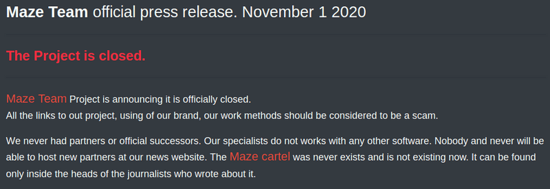 "Maze Team Project is announcing it is officially closed. All the links to out project, using of our brand, our work methods should be considered a scam."