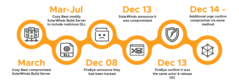 SolarWinds says around March this year its build server was compromised. It said the source code for its application was not compromised, but its build server was; and for a period of a couple of months – up until July – a malicious DLL was injected into all of the update packages. The APT group was either stopped or pulled out in July.