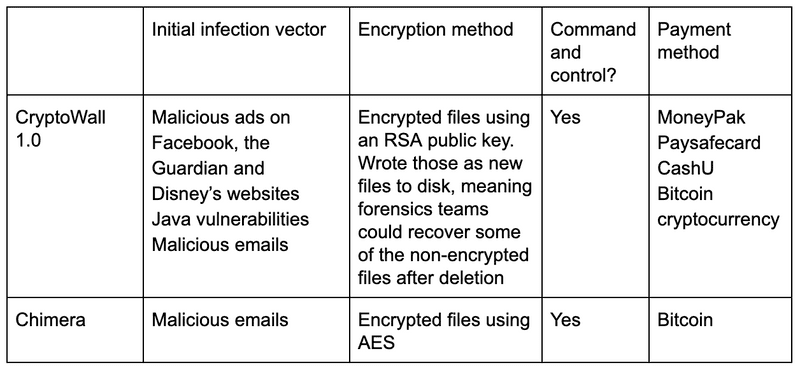 The former saw many revisions throughout 2014 and 2015, finalizing four different versions that remediated previous issues. Chimera meanwhile was a big ransomware sample in 2015, used to locate and enumerate network connected drives and encrypt many more files than most ransomware families had before. It renamed encrypted files with the file extension ‘.crypt’ to determine and keep track of affected files. Chimera was conscious of not encrypting important system files, so it tended to omit particular directories such as \Windows, \$Recycle.bin, \Microsoft, \Mozilla Firefox, \Opera, \Internet Explorer, \Temp, \Local, \LocalLow, and \Chrome.