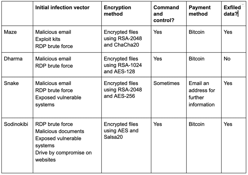 Finally, one important understanding is that newer variants of ransomware have an RDP brute force infection vector in common. This particular type of infection has seen a huge rise in the past few years and a major jump in 2020. This might be due in part to the Covid-19 pandemic. The virus has meant that companies have quickly had to implement remote working strategies, opening up their internal networks for employees to access from home. This culture shift, or societal change in the way we do things, has meant threat actors are adapting their methods to better suit a larger attack surface.
