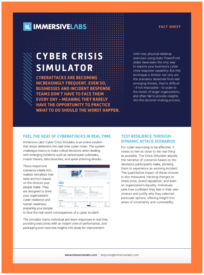 Immersive Labs’ Cyber Crisis Simulator is an online solution that drops defenders into real-time cyber crises. The system challenges teams to make critical decisions when dealing with emerging incidents such as ransomware outbreaks, insider threats, data breaches, and spear-phishing attacks.