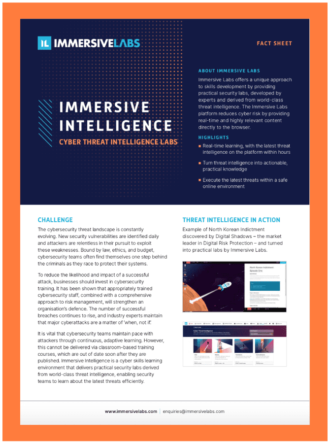 Immersive Intelligence provides users with hands-on experience of emerging threats and zero- day vulnerabilities. Our experts turn the latest threat intelligence feeds, vulnerability research and security blogs into browser-based labs, enabling incident response teams to handle new and evolving threats in a safe environment.