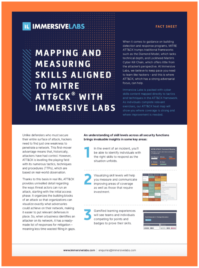 When it comes to guidance on building detection and response programs, MITRE ATT&CK trumps traditional frameworks such as the Diamond Model, which lacks technical depth, and Lockheed Martin’s Cyber Kill Chain, which offers little from the attacker’s perspective. At Immersive Labs, we believe to keep pace you need to learn like hackers – and this is where ATT&CK, which has a strong adversarial focus, can help.