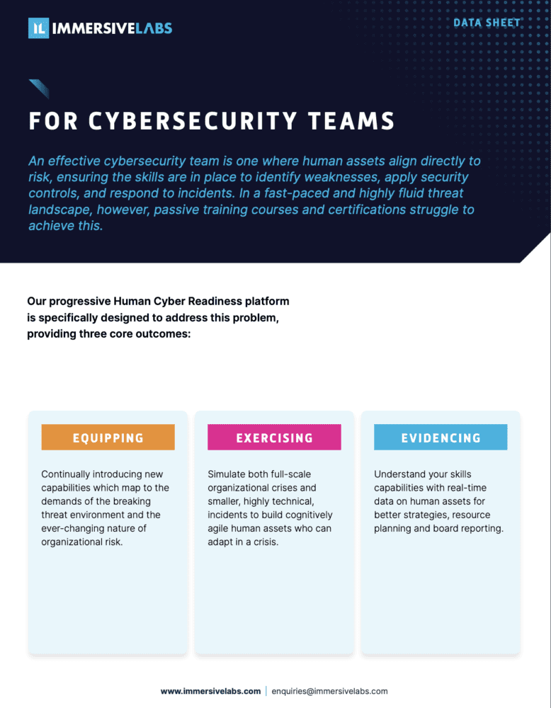 Immersive Labs embeds skills by immersing individuals in challenges, scenarios and simulations in the browser to teach everything from threat hunting and reverse engineering, to SecDevOps.