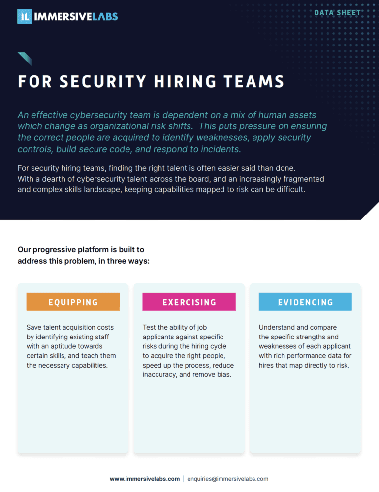 Immersive Labs improves the hiring cycle by measuring applicant capabilities in a series of browser-based simulations, all based on the latest threat intelligence. Compare the strengths and weaknesses of applicants For security hiring teams, finding the right talent is often easier said than done. With a dearth of cybersecurity talent across the board, and an…